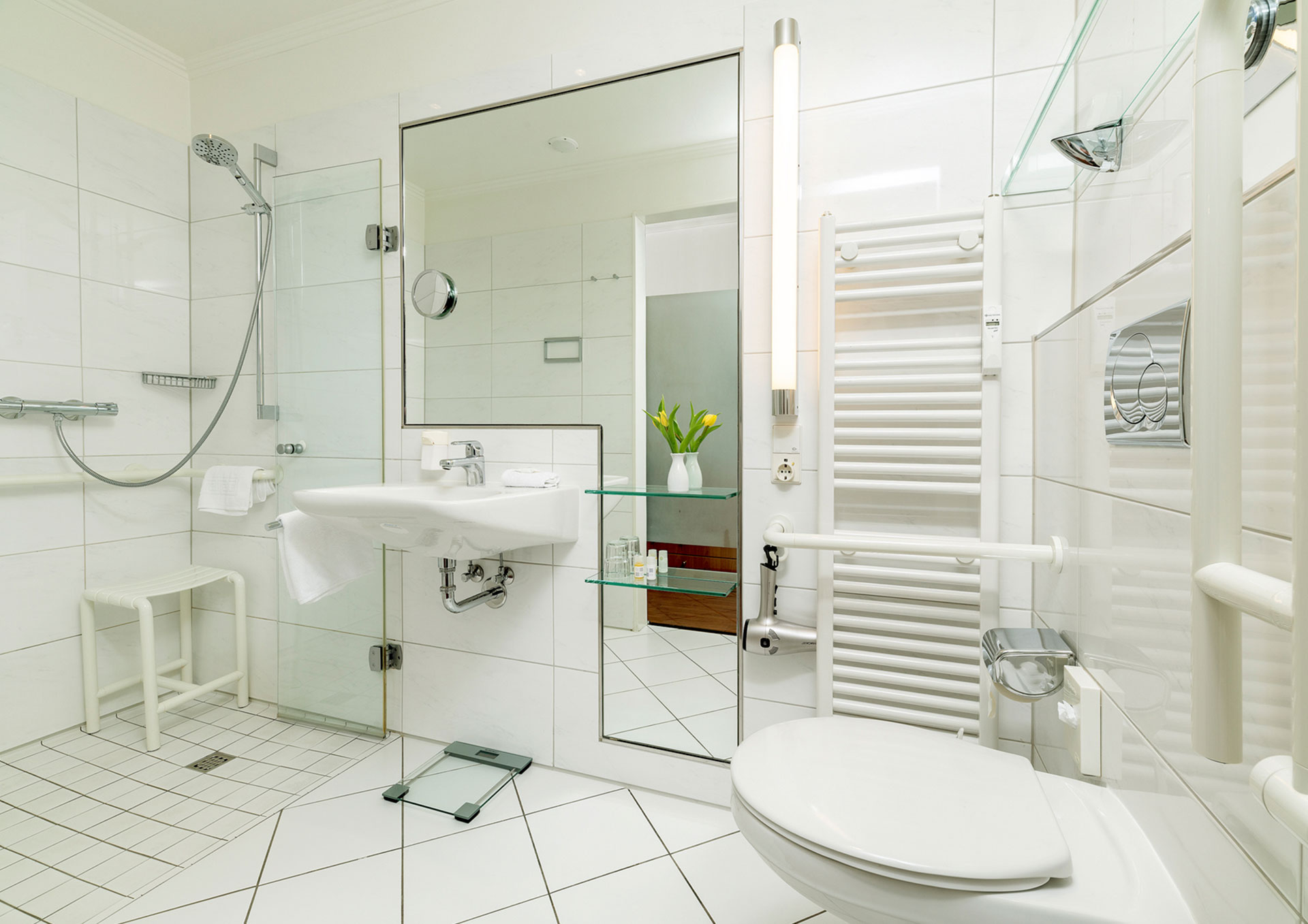 Geräumiges, rollstuhlgeeignetes Doppelzimmer mit Balkon zur Seeseite und herrlichen Meerblick, einem behindertenfreundlichen Duschbad mit unterfahrbaren Waschbecken und ebenerdiger Dusche und Haltegriffen, Kleiderschrank mit Safe, Schreibtisch, Lesesessel, Satelliten Flachbild TV, Minibar, Telefon, WLAN.